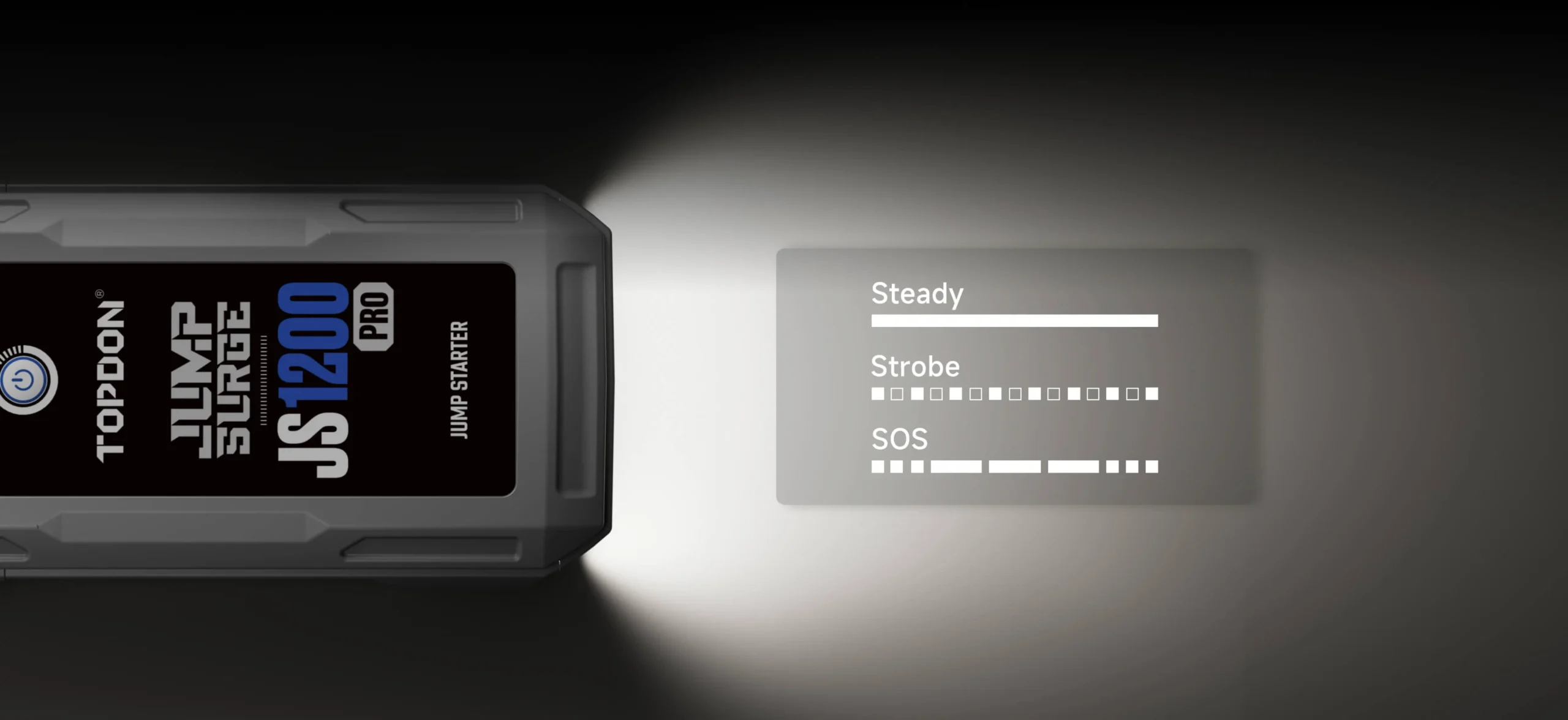 TOPDON JumpSurge 1200 PRO je vybaven LED svítidlem o výkonu 300 lumenů, které zajistí dostatek světla při práci u vozidla i v krizových situacích. Nabízí stálý režim, stroboskop i SOS signalizaci, čímž zvyšuje bezpečnost a využitelnost zařízení i mimo samotné startování.