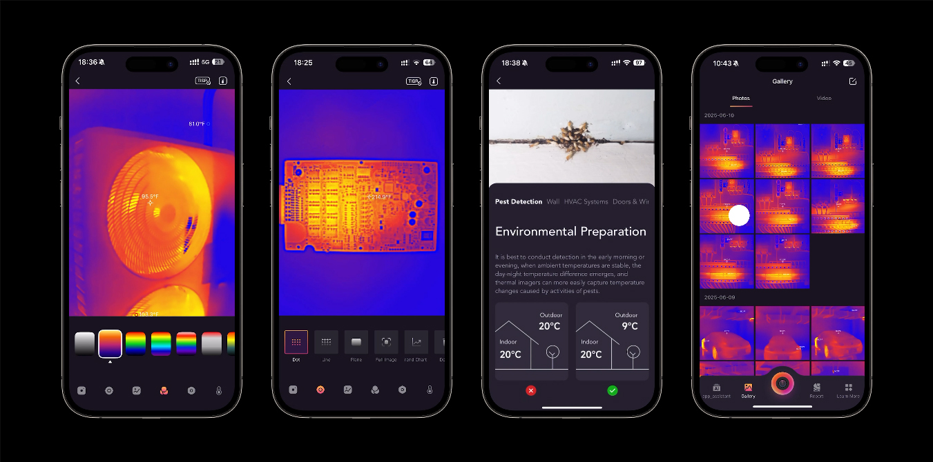 TC001 s IR rozlišením 256 × 192 px poskytuje detailní a přehledné termální snímky. Nabízí rotaci obrazu a pokročilé nástroje úpravy zobrazení pro pohodlnější práci a přesnější vyhodnocení teplotních rozdílů.