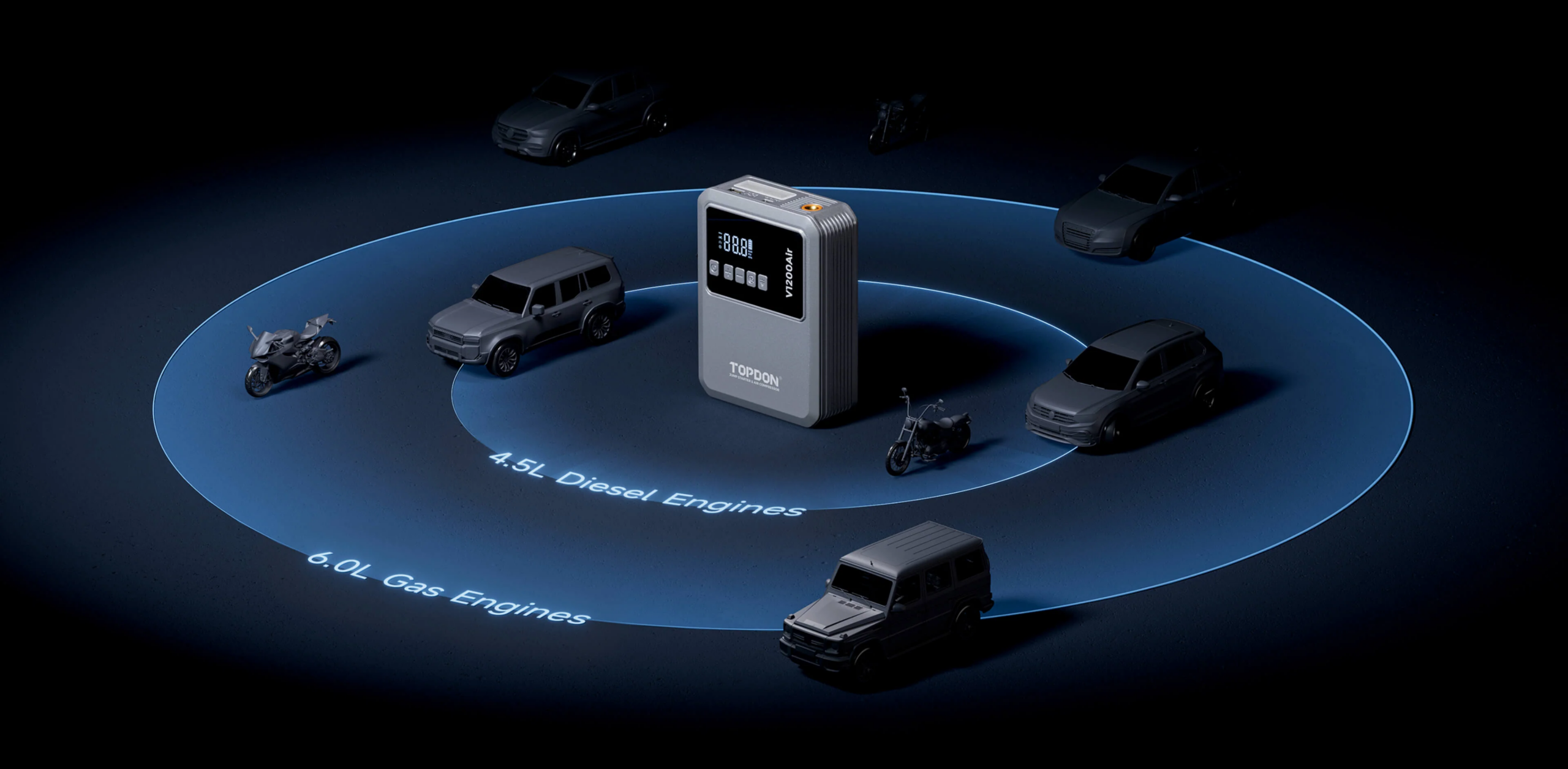 TOPDON V1200 Air si bez problémů poradí s vybitou, a dokonce i hluboce vybitou 12 V baterií u většiny běžných vozidel. Spolehlivě nastartuje osobní automobily, SUV, motorky i další vozidla vybavená 12 V systémem. Podporuje benzínové motory do objemu 6,0 l a dieselové motory do 4,5 l, takže vám umožní rychlý a bezpečný start během několika minut – bez nutnosti asistence či dlouhého čekání.